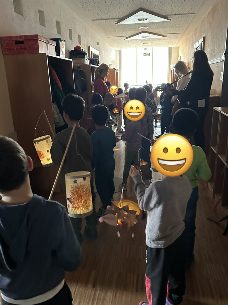 Anschließend fand ein Laternenumzug durch das Schulhaus statt. Die selbstgebastelten Laternen erhellten die Gänge in bunten Farben und sorgten für eine stimmungsvolle Atmosphäre. Im SVE Flur sangen die Kinder mit viel Freude bekannte Laternen- und Martinslieder, begleitet von leuchtenden Augen und fröhlicher Stimmung.